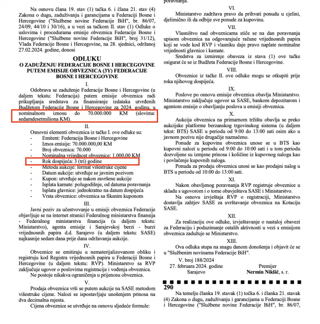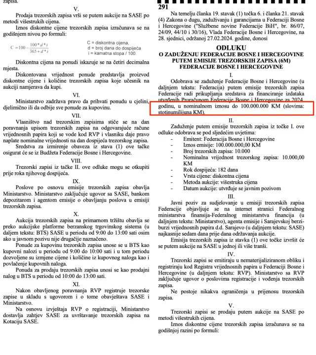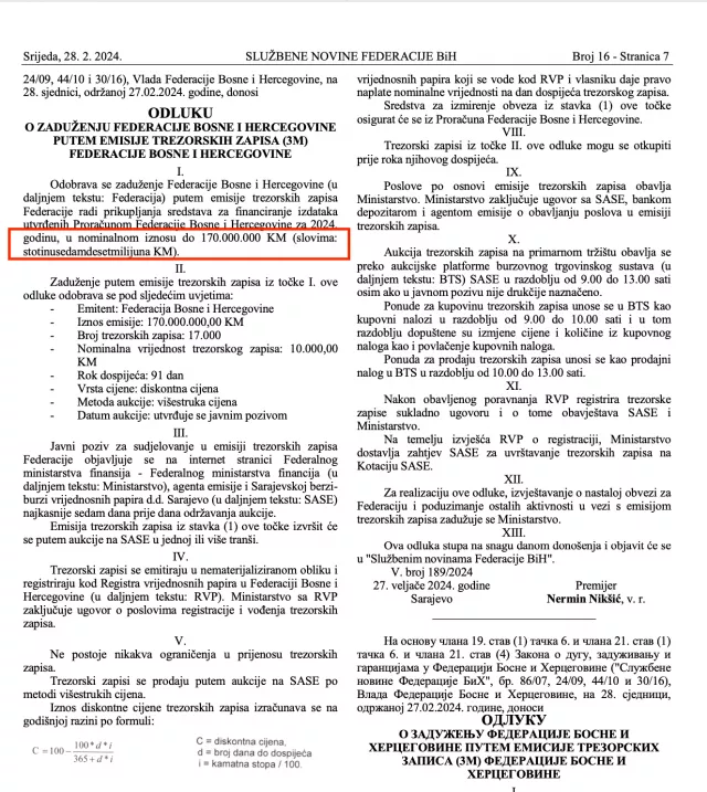 “Odobrava se“, piše u trećoj Odluci, “zaduženje Federacije Bosne i Hercegovine (u daljem tekstu: Federacija) putem emisije trezorskih zapisa Federacije radi prikupljanja sredstava za finansiranje izdataka utvrđenih Budžetom Federacije Bosne i Hercegovine za 2024. godinu, u nominalnom iznosu do 100.000.000 KM (slovima: stotinumiliona KM).