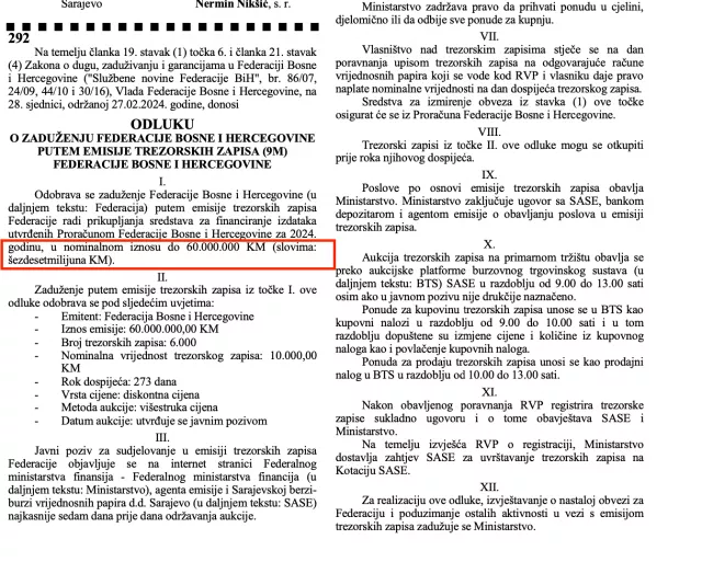 Četvrtom Odlukom, donesenom 27. februara, “odobrava se zaduženje Federacije Bosne i Hercegovine (u daljem tekstu: Federacija) putem emisije trezorskih zapisa Federacije radi prikupljanja sredstava za finansiranje izdataka utvrđenih Budžetom Federacije Bosne i Hercegovine za 2024. godinu, u nominalnom iznosu do 60.000.000 KM (slovima: šezdesetmiliona KM)”.