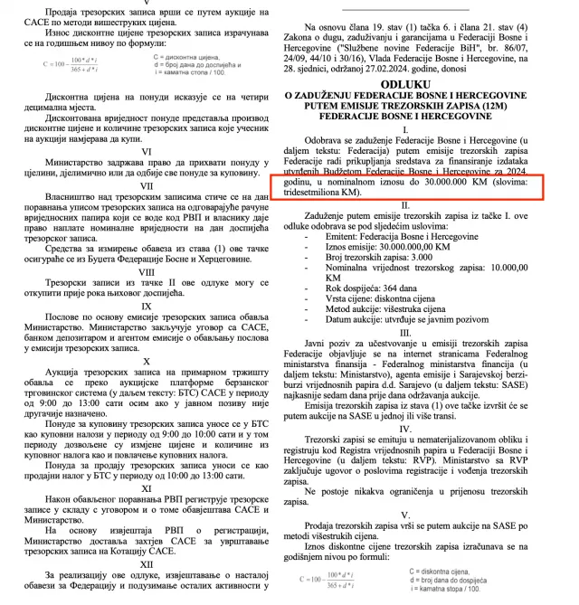 I, na kraju, Vlada FBiH “odobrava zaduženje Federacije Bosne i Hercegovine (u daljem tekstu: Federacija) putem emisije trezorskih zapisa Federacije radi prikupljanja sredstava za finansiranje izdataka utvrđenih Budžetom Federacije Bosne i Hercegovine za 2024. godinu, u nominalnom iznosu do 30.000.000 KM (slovima: tridesetmiliona KM).