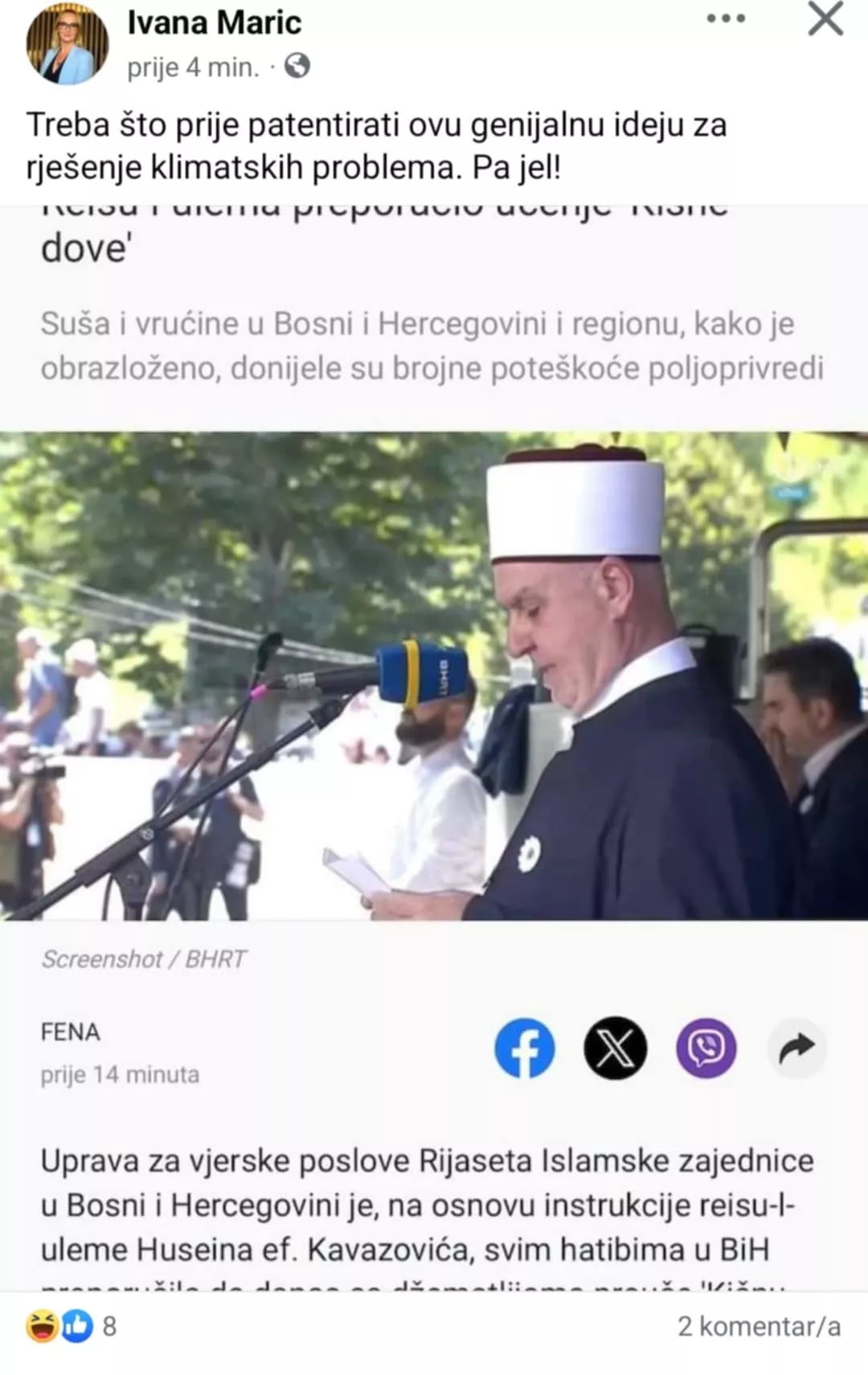 Politička analitičarka ili agitatorica aktuelne vlasti i stranaka trojke Ivana Marić danas je na svojim profilima na mreži X i Facebook ismijavala reisul-ulemu Islamske zajednice u BiH Huseina ef. Kavazovića.