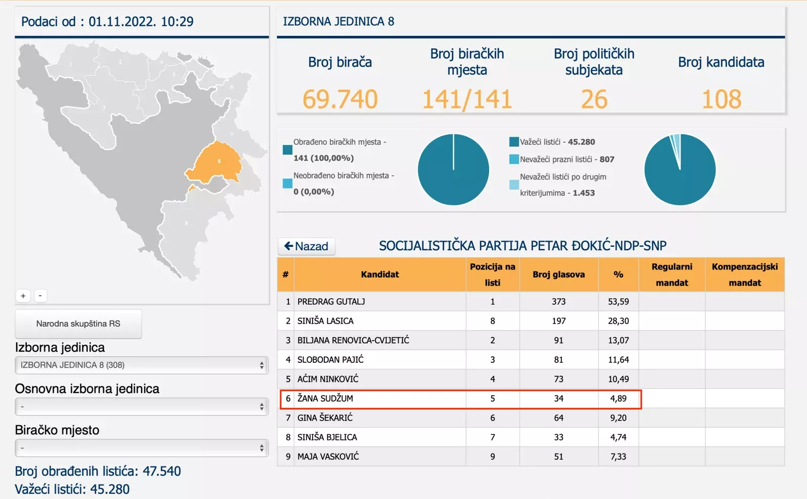 “Na listi Socijalističke partije su obrazovani, mladi, profesionalni i stručni ljudi koji će sigurno biti budućnost Srpske i nosilac njenog razvoja”, kazala je 2022. godine na predizbornom skupu u Istočnom Sarajevu Žana Sudžum.