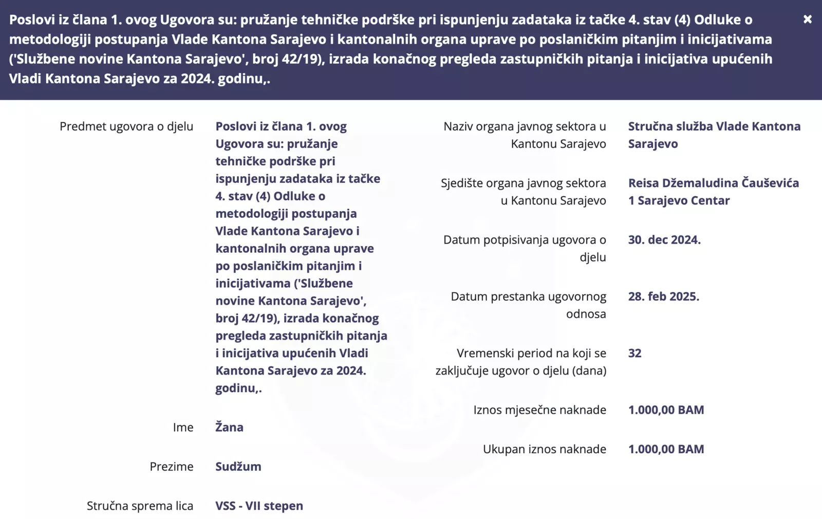 “Poslovi iz člana 1. ovog Ugovora su: pružanje tehničke podrške pri ispunjenju zadataka iz tačke 4. stav (4) Odluke o metodologiji postupanja Vlade Kantona Sarajevo i kantonalnih organa uprave po poslaničkim pitanjima i inicijativama (‘Službene novine Kantona Sarajevo’, broj 42/19), izrada konačnog pregleda zastupničkih pitanja i inicijativa upućenih Vladi Kantona Sarajevo za 2024. godinu”, navedeno je na stranici Ureda za borbu protiv korupcije Kantona Sarajevo pored imena Žana Sudžum.
