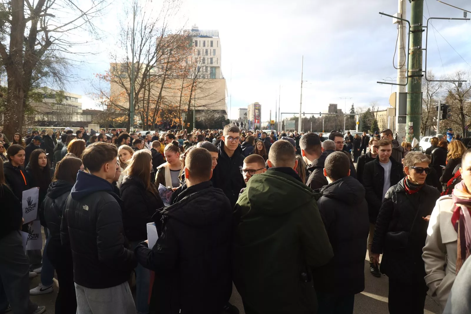 Građani su već na početku protesta blokriali glavnu gradsku saobraćajnicu, odnosno cijela raskrsnica, pa je zaustavljen saobraćaj u oba smjera.