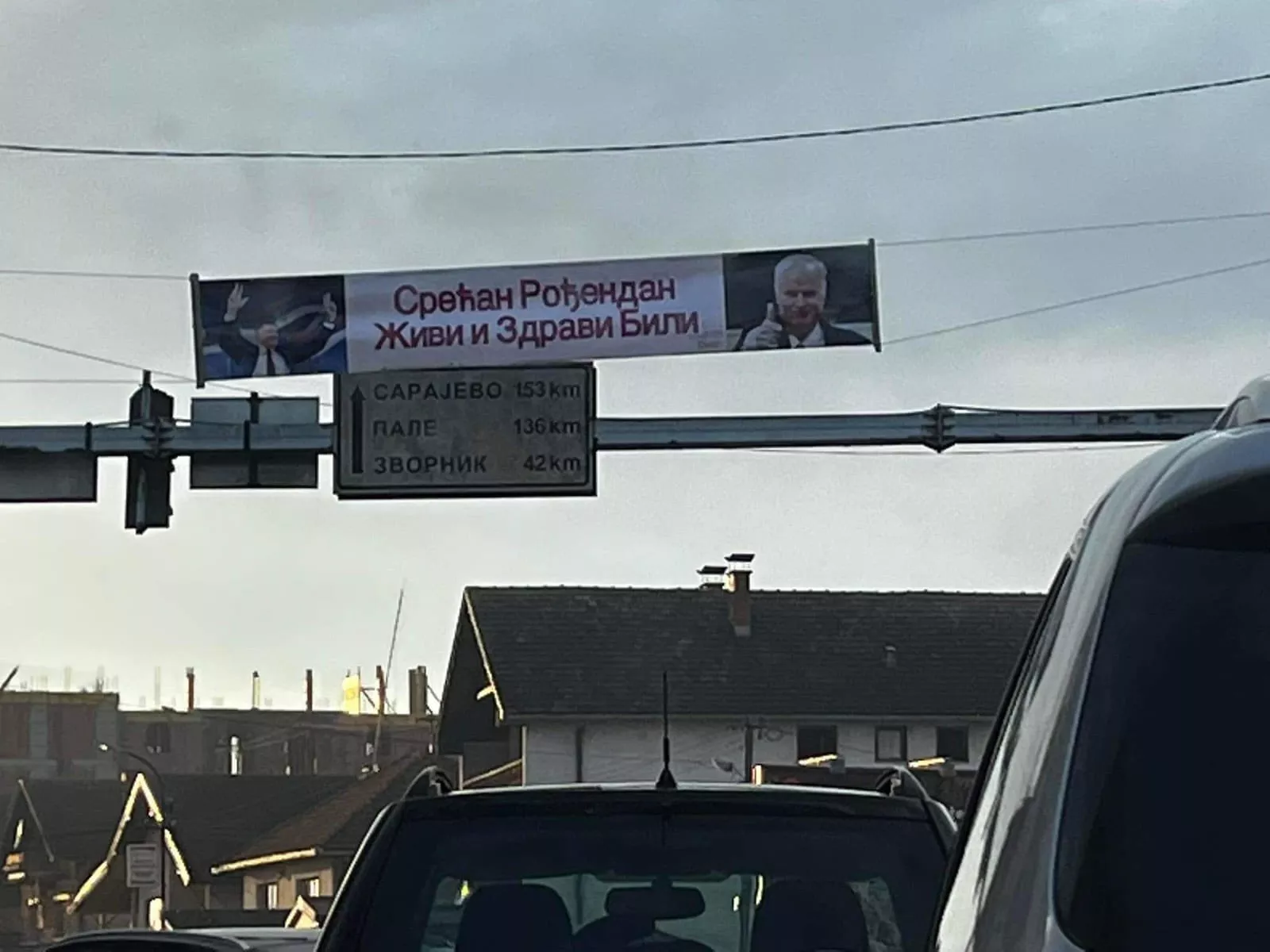 Na raskrsnici u Bratuncu, nedaleko od @SrebrenicaMC , postavljen je tansparent na kojem je ispisana rođendanska čestitka osuđenom ratnom zločincu Ratku Mladiću pic.twitter.com/jh9hwGOeD3