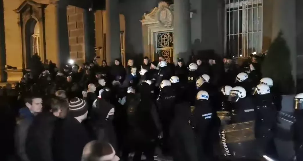 Desničari, koji su protestovali u centru Beograda zbog zapadnog plana za Kosovo, u jednom trenutku su porušili ogradu pored Predsjedništva i prišli zgradi uzvikujući "gdje je Vučić" i "izdaja, izdaja".