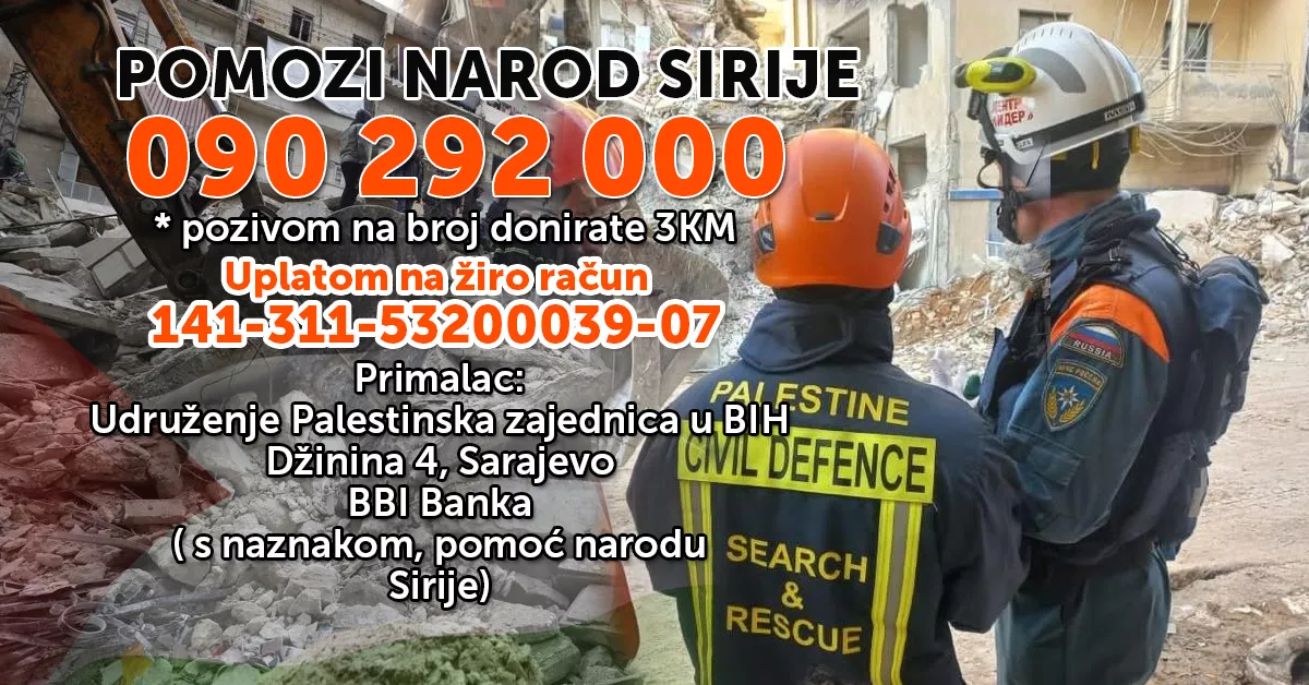 Pomoći možete i direktno uplatom na žiro račun kod BBI Banke, broj računa : 141-311-53200039-07 (primalac Udruženje Palestinska zajednica u BiH, Džinina 4, Sarajevo – s naznakom “Pomoć za Siriju").