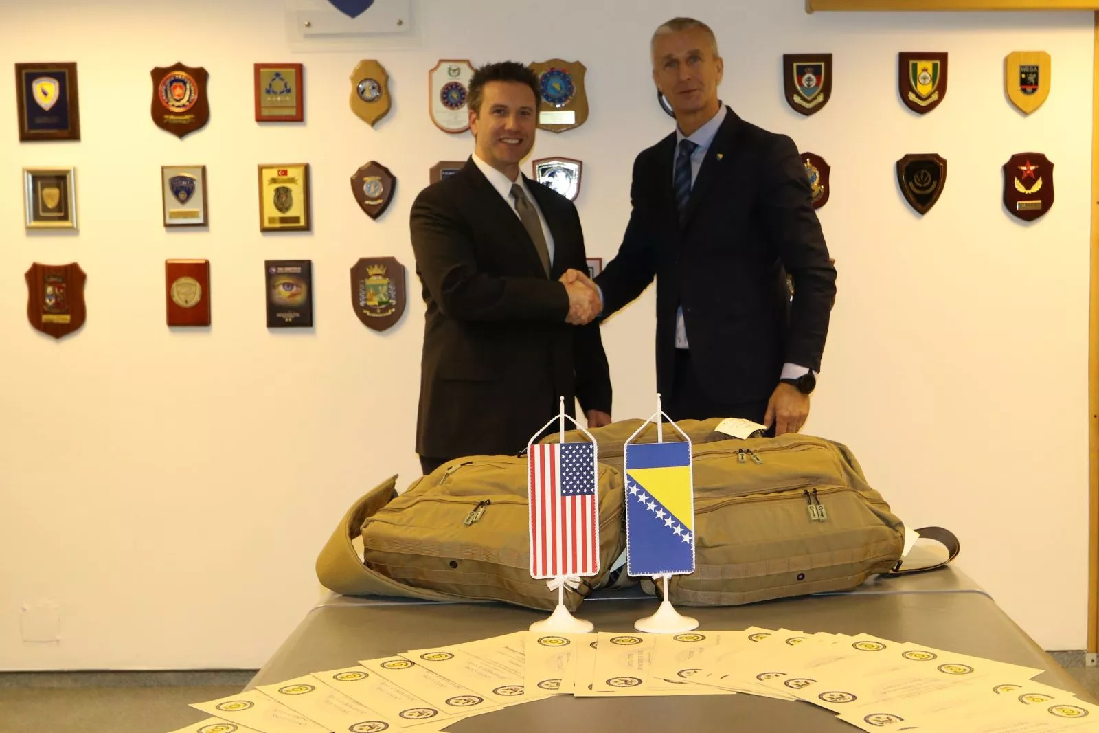 SARAJEVO, (Patria) - Mark Romanowski, zamjenik šefa Ureda regionalne sigurnosti Ambasade SAD-a u BiH danas je uručio certifikate o uspješno završenoj obuci “Pružanje prve pomoći u borbenim uslovima” za 44 policijska službenika Direkcije za koordinaciju policijskih tijela BiH.