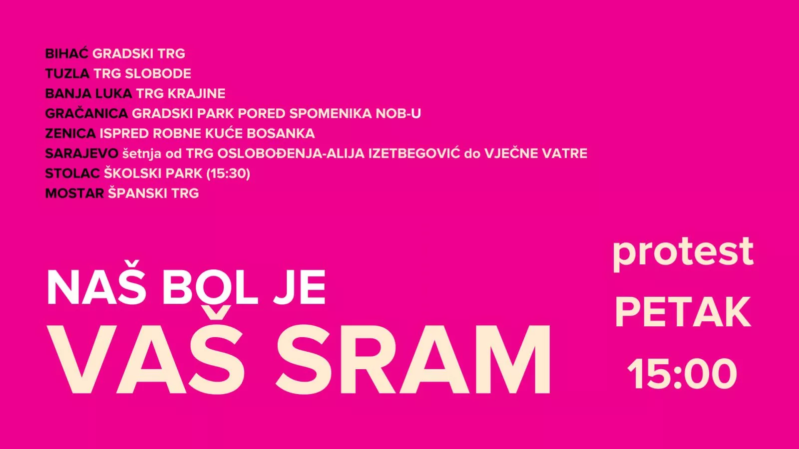 “Pozivamo i druge gradove da se priključe i jave lokaciju kako bi ih mogli dodati na listu. Stojimo solidarno sa ženama Srbije i Kosova koje su također izašle na ulice. Naš bol je vaš sram!”, zaključile su.