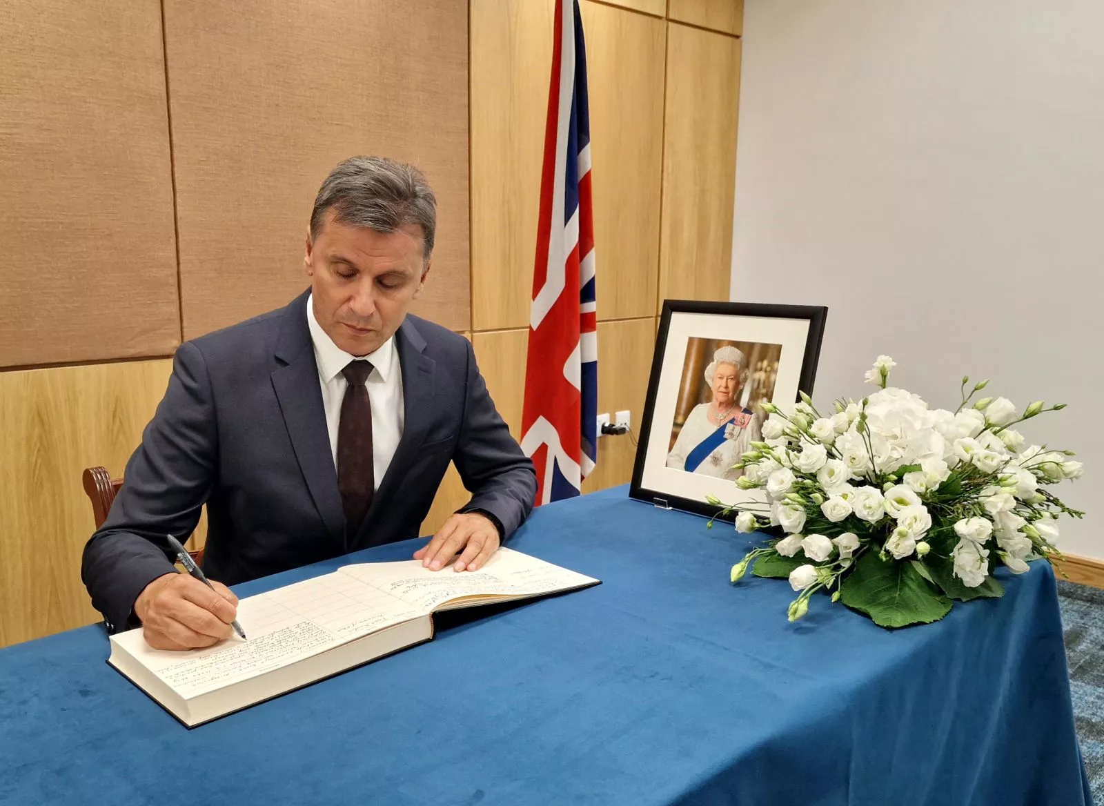 SARAJEVO, (Patria) - Premijer Federacije Bosne i Hercegovine Fadil Novalić upisao se u Knjigu žalosti koja je otvorena povodom smrti kraljice Elizabete II u Ambasadi Ujedinjenog Kraljevstva Velike Britanije i Sjeverne Irske u Sarajevu.
