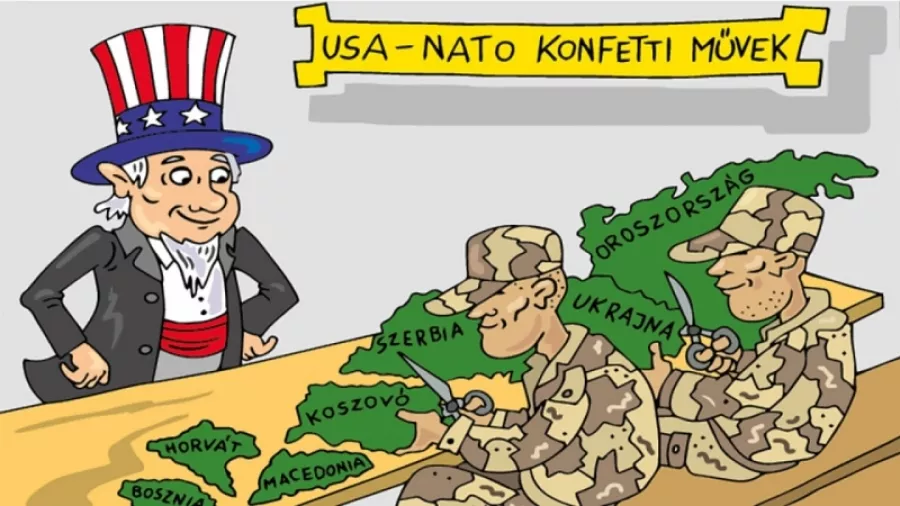 SARAJEVO, (Patria) - Mađarski su udžbenici puni laži i kontroverznih crteža. U udžbeniku geografije za osmi razred mađarskih osnovnih škola nalazi se crtež koji prikazuje podjelu Jugoslavije devedesetih, koju cijepa NATO-a pod američkim nadzorom.