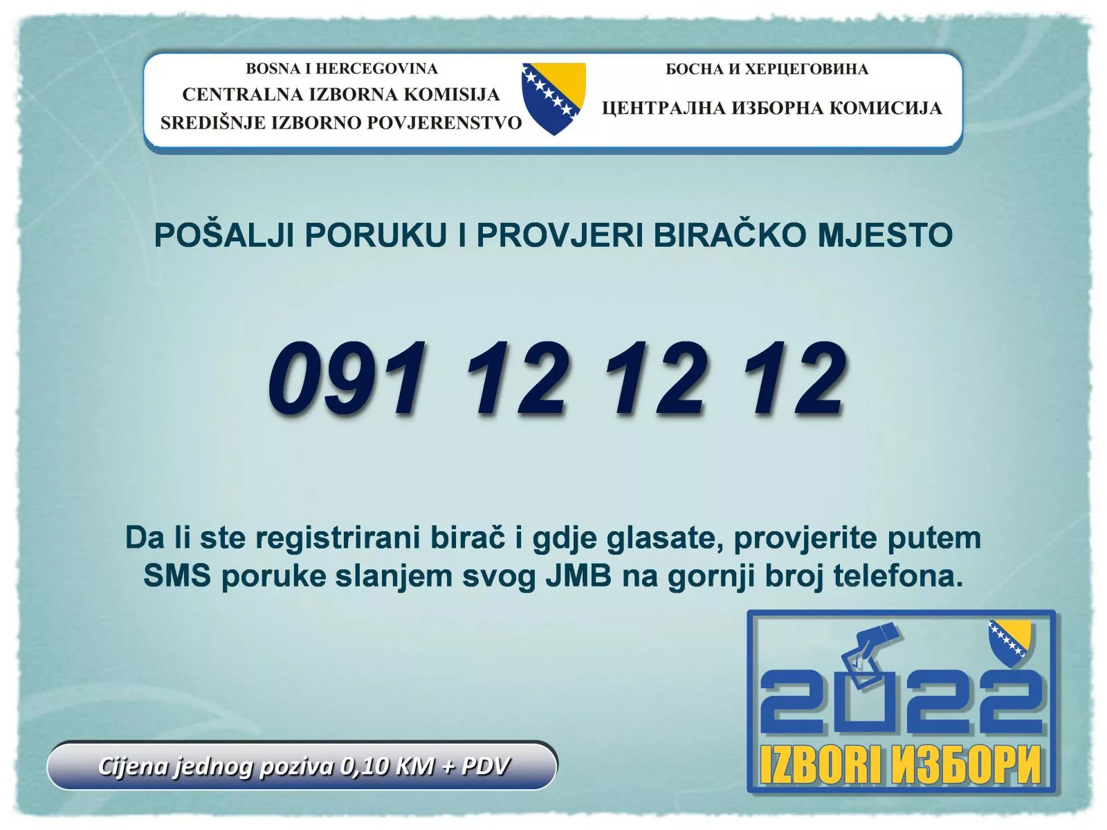 (Patria) - Centralna izborna komisija Bosne i Hercegovine ponovo je aktivirala SMS centar za provjeru biračkog mjesta i on će biti u funkciji od ponedjeljka, 12.09.2022. godine za sve telekom operatere u Bosni i Hercegovini. Trenutno se SMS centar testira.
