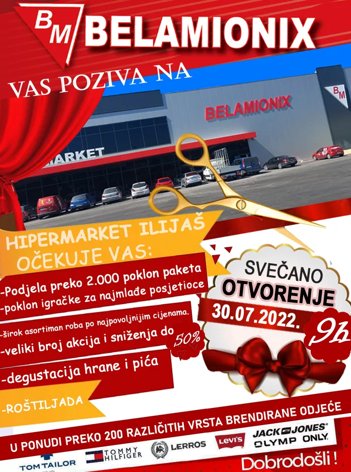(Patria) - Maloprodajni lanac Belamionix najavljuje u subotu 30. jula 2022.godine sa početkom od 9 sati svečano otvorenje novog hipermarketa na adresi Podlugovi bb (opština Ilijaš).