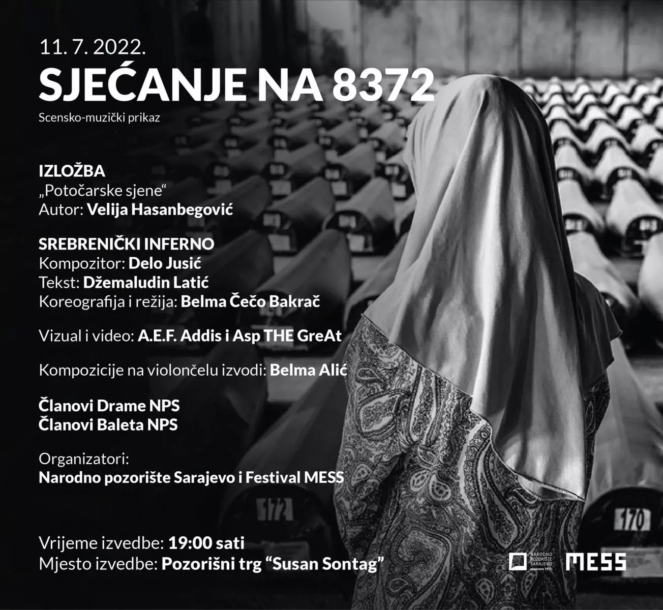 SARAJEVO, (Patria) - Narodno pozorište Sarajevo u organizaciji sa Festivalom MESS sutra će u Sarajevu, povodom obilježavanja sjećanja na genocid u Srebrenici prirediti specijalni scensko-muzički prikaz pod nazivom “Sjećanje na 8372”.