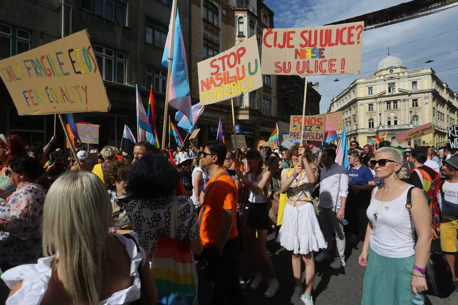 - Moj problem leži u društvu među zakonima institucijama koje ne prepoznaju sve porodice kao valinde. Evo nas ispred vas van naša četiri zida. Pokazujemo da život nije i nemože da se svede na ta četiri zida. Tu smo i ne idemo nikuda. Svi kordoni policije, betonske ograde znače četiri zida. Otvorite povorku ka našim komšijama komšinicama. Pokažite da ste za slobodu i poštivanje svih ljudskih prava Prestanimo okretati glavu od nasilja svakog oblika. Ne nasilju apsolutno da prihvatanju i zajedništvu. Želimo graditi sigurno budućnost za sve LGBTIQ+ osobe, naglasila je Bajraktarević.