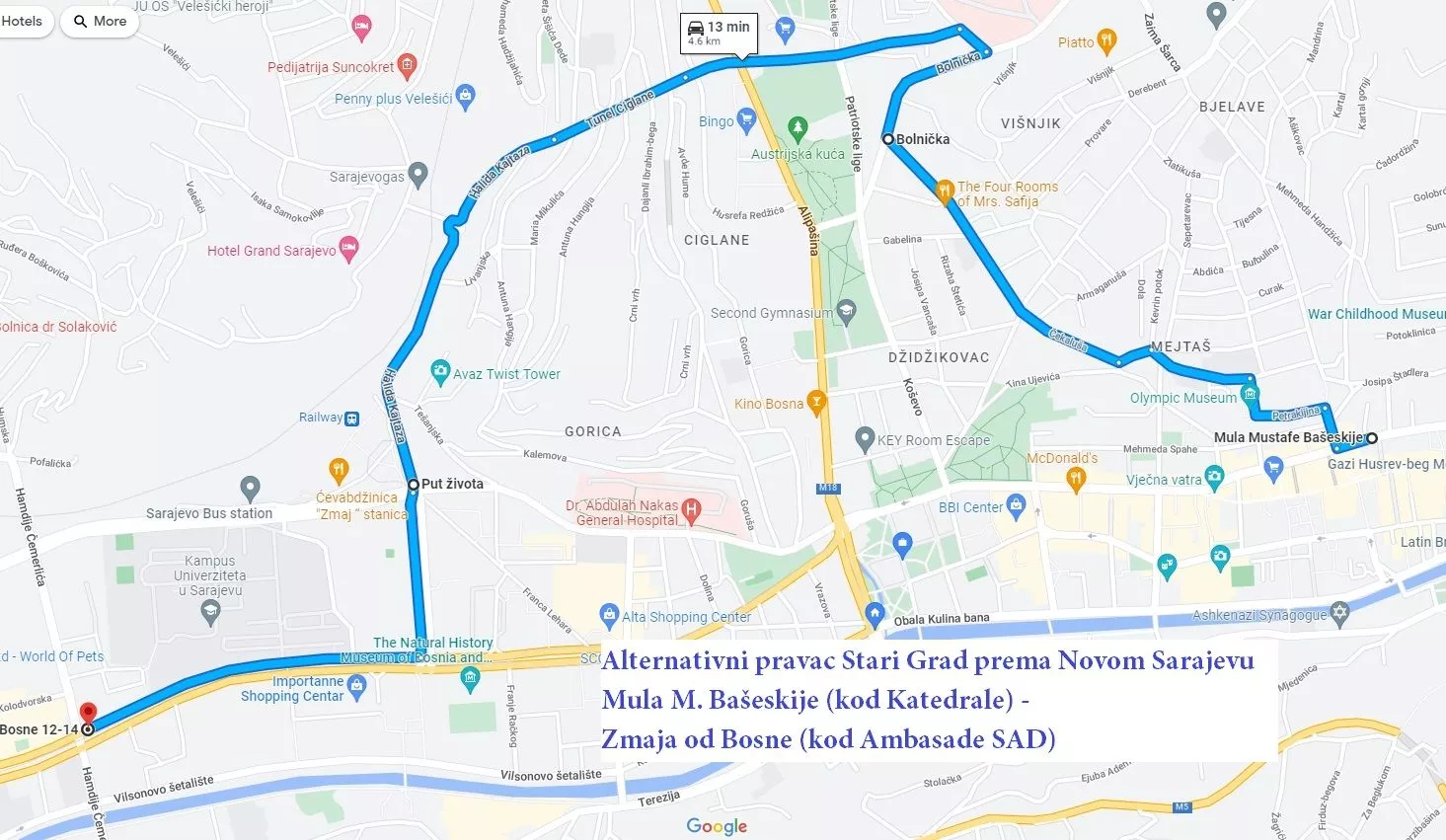 Alternativni pravac odvijanja saobraćaja iz pravca Starog Grada prema Novom Sarajevu je: Mula Mustafe Bašeskije (kod Katedrale) - Petrakijina - Mehmed Paše Sokolovića - Čekaluša - Bolnička - Stjepana Tomića - Tunel Ciglane - Halida Kajtaza - Zmaja od Bosne (kod Ambasade SAD).