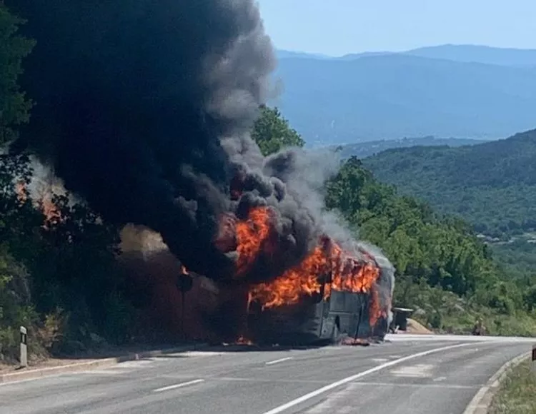 SARAJEVO, (Patria) - Autobus koji je prevozio učenike iz Širokog Brijega na ekskurziju u Hrvatsku, zapalio se tokom vožnje na cesti D-76 kod Imotskog.