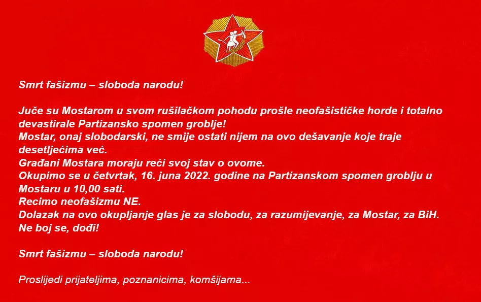 "Građani Mostara moraju reći svoj stav o ovome. Okupimo se u četvrtak, 16. juna 2022. godine na Partizanskom spomen groblju u Mostaru u 10,00 sati. Recimo neofašizmu NE", ističu iz mostarskog UABNOR-a.