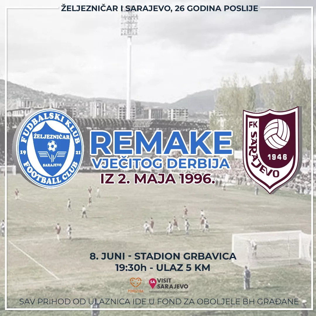 SARAJEVO, (Patria) - Na stadionu Grbavica večeras od 19:30 sati bit će održan remake prvog poslijeratnog derbija koji je odrigran između Željezničara i Sarajeva. Nosilac projekta je udruženje Pomozi.ba, a ovaj jedinstven sportski događaj ima humanitarni karakter jer sav prihoda ide u Fond za liječenje „Sportisti za život“.