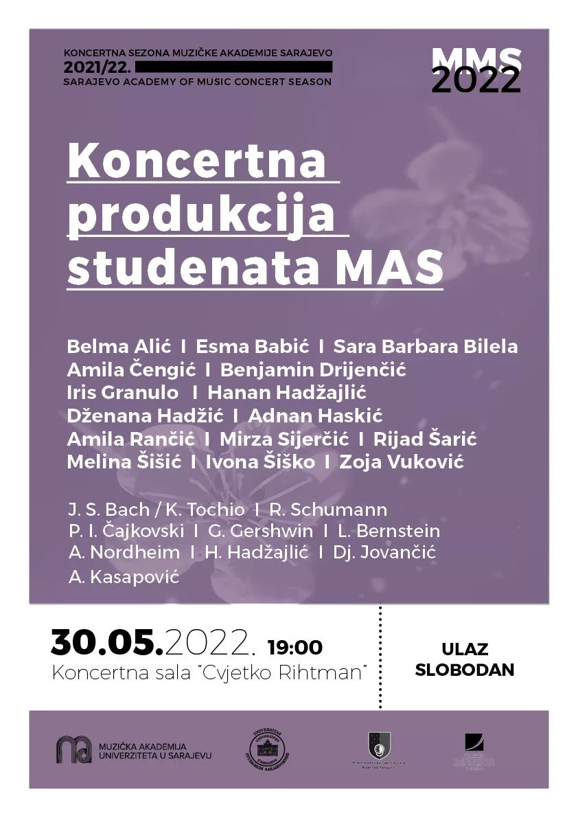 (Patria) - Na Muzičkoj akademiji Univertiteta u Sarajevu sutra će biti priređeno drugo predstavljanje studenata Muzičke akademije UNSA, realizovano kao dio programa festivala Majske muzičke svečanosti. Ovom prilikom će nastupiti studenti različitih odsjeka, a njihov koncert će početi u 19 sati.