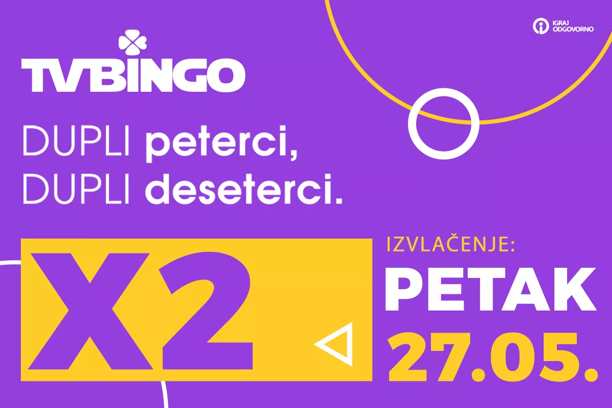 Lutrija BiH nastavlja donositi sreću kroz dvostruke iznose dobitaka! U petak 27. maja, u 21. kolu igre TV Bingo Show, pored ostalih novčanih dobitaka i Jackpota od 1.051.00,00 KM, igrače očekuju i dvostruki iznosi dobitaka za pogođenih pet (peterac) i deset brojeva (deseterac). U dvostrukim dobicima učestvuju svi listići na kojima je ostavaren dobitak od pet i deset brojeva odigranih u periodu od 21. 5. .2022. (subota) - 27. 5. 2022. (petak) do 18:00h.