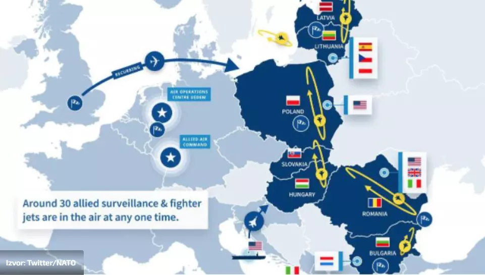 Od Estonije na sjeveru pa sve do Bugarske na jugu, nebo saveznika čuvaju vojni avioni Sjedinjenih Američkih Država, Španjolske, Njemačke, Italije i ostalih saveznika.