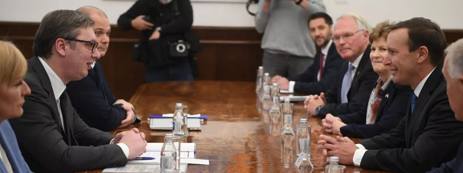 (Patria) - Predsjednik Republike Srbije Aleksandar Vučić sastao se danas sa američkim senatorima Odbora za vanjske poslove Krisom Marfijem i Džin Šejhin, kao i senatorom Odbora za oružane snage Tomom Tilisom, sa kojima je razgovarao o bilateralnoj saradnji, evropskim integracijama Srbije, situaciji u regionu, energetici i krizi u Ukrajini. Podsjećamo, ovi sentaori dolaze i u BiH sutra.