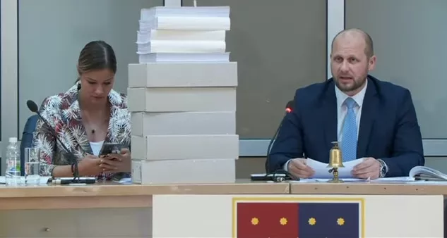 SARAJEVO, (Patria) - Nakon pauze predsjedavajući Skupštine KS Elvedin Okerić donio je printani materijal u velikim količinama koji bi svaki zastupnik trebao dobiti prije sjednice.