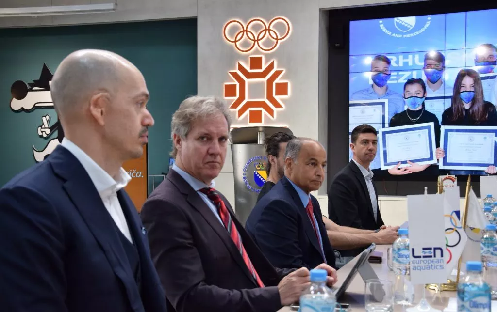 SARAJEVO, (Patria) - Predstavnici svjetske organizacije vodenih sportova (FINA) i evropske plivačke federacija (LEN) danas su se u Sarajevu sastali sa čelnicima uprave Plivačkog saveza Bosne i Hercegovine u Olimpijskom komitetu Bosne i Hercegovine.
