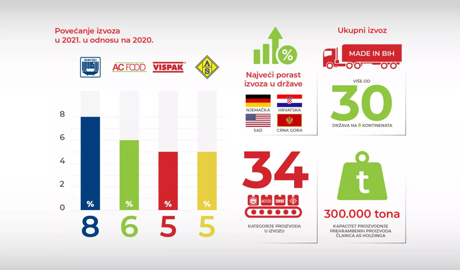 (Patria) - Kompanije AS Holdinga u prošloj godini povećale su izvoz u odnosu na 2020. godinu. Tako je prošle 2021. godine Solana Tuzla ostvarila povećanje izvoza za 8 posto u usporedbi sa 2020. godinom, Vispak i AS Jelah su rasli po 5 posto, a AC Food 6 posto.