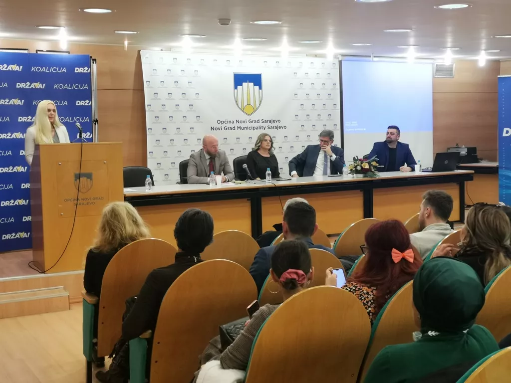SARAJEVO, (Patria) - Javna tribina koalicije Država! na temu Budućnost Bosne i Hercegovine održana je večeras u zgradi općine Novi Grad Sarajevo. Na tribini su govorili Mirsad Hadžikadić, predsjednik Platforme za progres i kandidat za člana Predsjedništva u ime koalicije Država!, generalni sekretar Nezavisnog bloka Vedad Gačanović, predstavnik pokreta RED i federalni zastupnik, Adis Arapović, dopredsjedavajuća Općinskog vijeća Novi Grad i članica Predsjedništva Platforme za progres, Maja Muftić – Dedović i Dženana Delić, predsjednica KO Napredne demokratske stranke BiH.