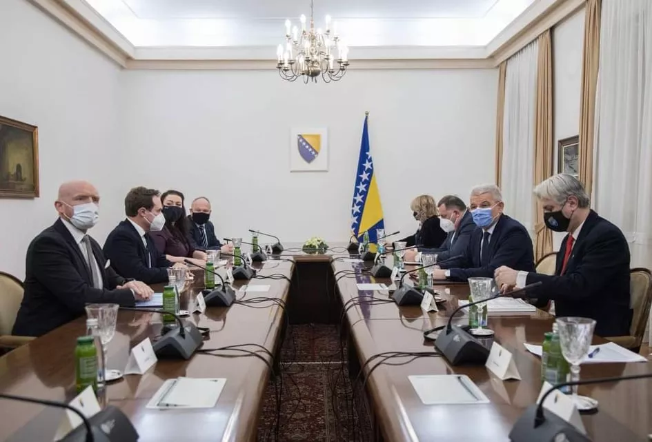 SARAJEVO, (Patria) - Članovi Predsjedništva Bosne i Hercegovine Šefik Džaferović i Milorad Dodik primili su članove Odbora za vanjsku politiku britanskog Parlamenta Na sastanku je razgovarano o aktuelnoj političkoj i ekonomskoj situaciji u Bosni i Hercegovini i bilateralnim odnosima Bosne i Hercegovine i Ujedinjenog Kraljevstva.