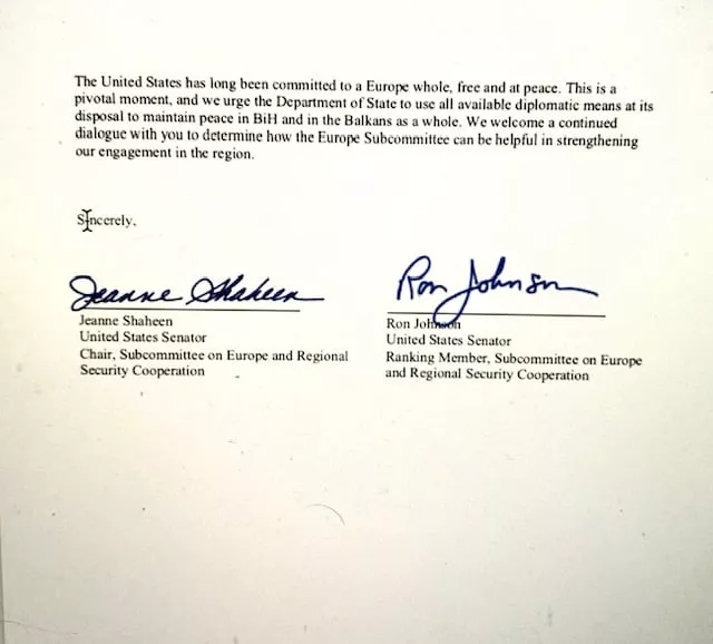Tako piše u pismu čije fotografije je objavio Avdović i kojeg su uputili američki senatori Jeanne Shaheen iz Demokratske stranke (Chair, Subcommittee on Europe and Regional Ranking Member, Subcommittee on Europe) i senator Ron Johnson iz Republikanske partije (Security Cooperation and Regional Security Cooperationna). Pismo je poslato na adresu jedne od vodećih osoba u State Departmentu uvažene Dr. Karen Donfried (Assistant Secretary for European and Eurasian Affairs The United States Department of State), koja je šefica Escobaru i Palmeru. Rekao bih da je bolje da je pismo upućeno nego državnom sekretaru Antoni Blinkenu koji je preokupiran prije svega Ukrajinom i razgovorima s Rusijom oko toga, mišljenja je Avdović.