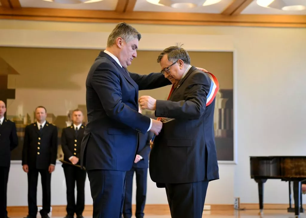 (Patria) - Predsjednik Republike Zoran Milanović odlikovao je Veleredom kralja Dmitra Zvonimira s lentom i Danicom Vinka kardinala Puljića, nadbiskupa metropolita vrhbosanskog. Odlikovanje kardinalu Puljiću dodijeljeno je za izniman doprinos u očuvanju hrvatskog identiteta te za iznimne uspjehe u međureligijskom, kulturnom i humanitarnom djelovanju. Odlikovanje je primio uz sevdalinku "Tebi majko misli lete".
