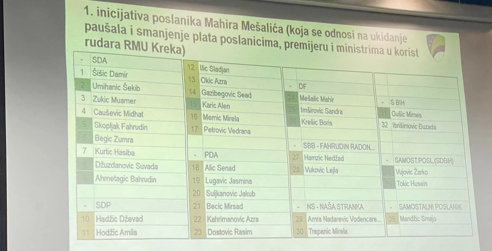 Iz Skupštinske većine PDA, SBB, SDP, Naša stranka prijedlog je podržao samo jedan poslanik SDP-a. Prema Mešalićevoj procjeni samo od ušteda na osnovu ove inicijative uštedilo bi se oko 1,7 miliona KM što bi bila značajna pomoć rudarima.