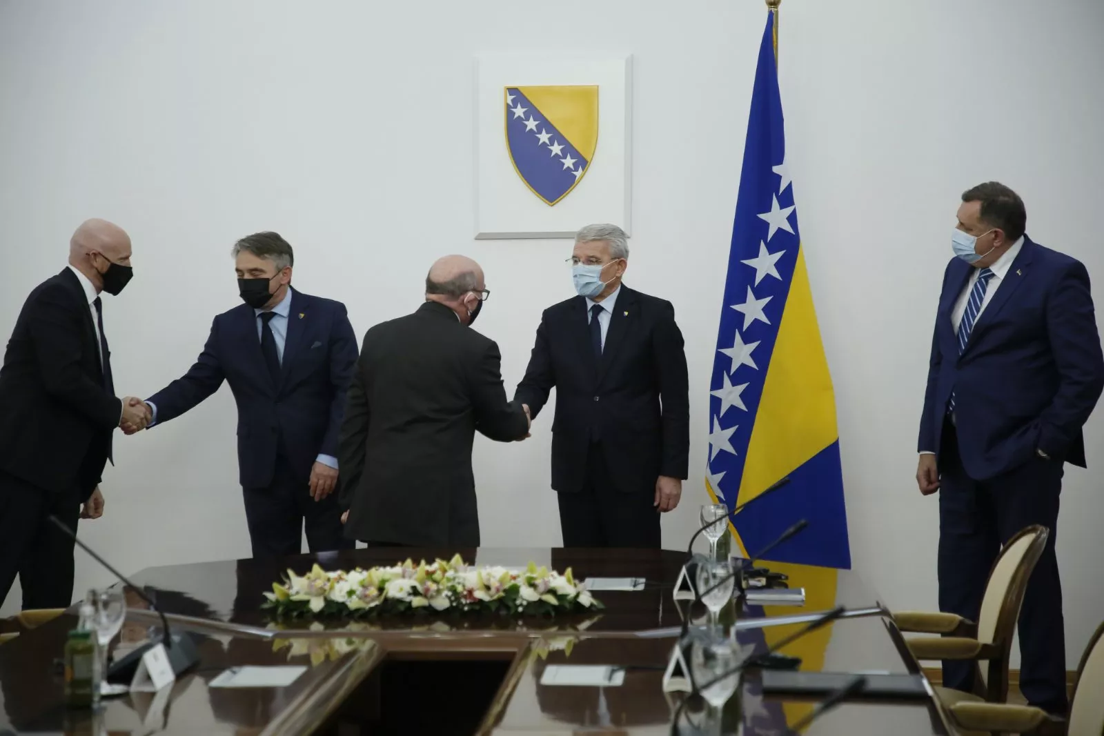 (Patria) - Specijalni izaslanik premijera Velike Britanije za zapadni Balkan Sir Stuart Peach stigao je u Predsjendištvo Bosne i Hercegovine. Dočekala su ga sva tri člana Predsjedništva BiH, a Dodik je poštujući epidemiološke mjere, držao i distancu od Šefka Džaferovića i predsjedavajućeg Željka Komšića. Također, držao je ruku u džepu dok se pozdravljaos gostom.