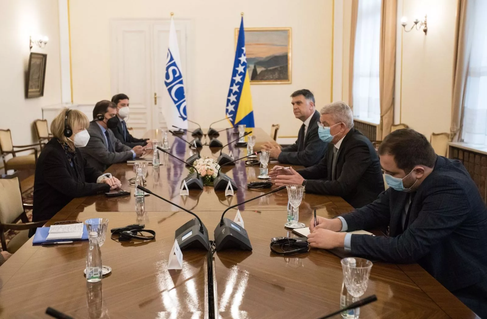 (Patria) - Član Predsjedništva BiH Šefik Džaferović primio je generalnu sekretarku OSCE-a Helgu Mariju Schmid. Razgovarano je o aktuelnoj sigurnosnoj krizi izazvanoj unilateralnim postupcima vlasti entiteta Republika Srpska. Član Predsjedništva Bosne i Hercegovine Džaferović naglasio je da vlasti entiteta RS mogu ostvariti svoje najave samo pokušajem primjene protivpravne sile protiv institucija države Bosne i Hercegovine, čime bi srušile mir u Bosni i Hercegovini.
