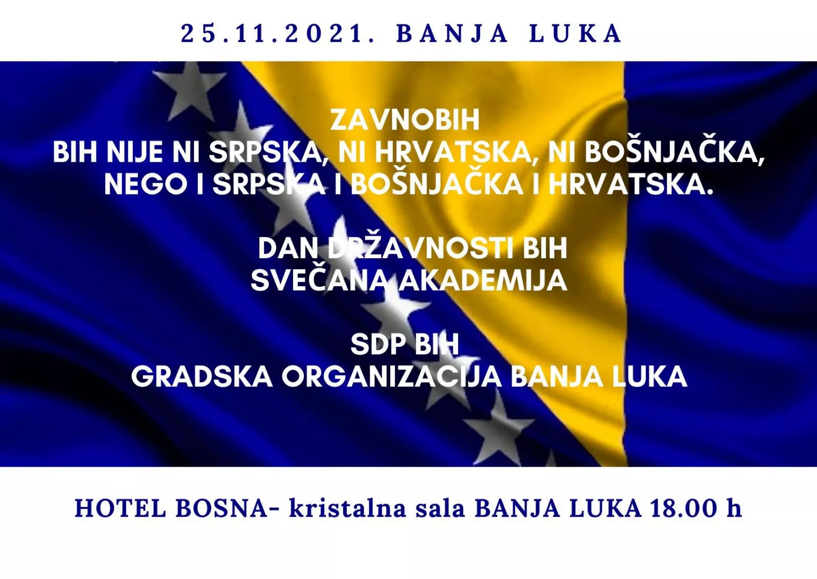 Zato 25.11.2021. godine u kristalnoj sali Hotela Bosna, svečana akademija povodom Dana državnosti BiH i godišnjica ZAVNOBiH-a. Mi svoju domovinu volimo i branimo u Banja Luci. BiH nije ni srpska, ni bošnjačka, ni hrvtaska, već i srpska, i bošnjačka i hrvatska, jer tako su nas naučili naši djedovi!!!", objavio je Vojin Mijatović, potpredjednik SDP-a.