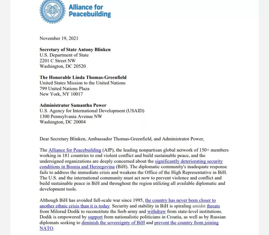 (Patria) - Alijansa za izgradnju mira (AfP) globalna vodeća nestranačka globalna mreža sa preko 150 članica koje u 181 državi rade na okončanju nasilnog sukoba i izgradnji održivog mira uputila je danas otvoreno pismo američkom državnom sekretaru Anthonyju Blinkenu, predstavnici SAD-a u Vijeću sigurnosti UN-a, Lindi Thomas-Greenfield, kao i administratorici USAID-a Samanthi Power.