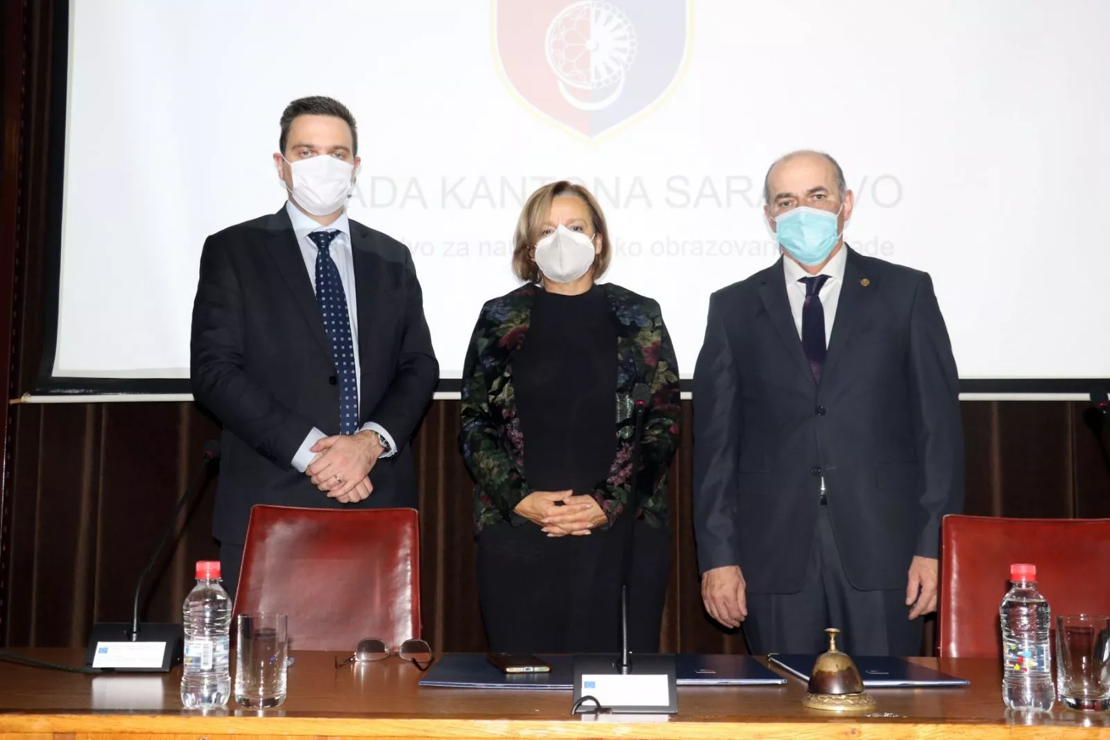 SARAJEVO, (Patria) - Ministrica za nauku, visoko obrazovanje i mlade Kantona Sarajevo, prof.dr. Aleksandra Nikolić, rektor Univerziteta u Sarajevu, prof.dr. Rifat Škrijelj potpisali su danas na prigodnoj svečanosti u amfiteatru Akademije nauka i umjetnosti Bosne i Hercegovine ugovore sa dobitnicima sredstava iz programa „Sufinansiranje naučnoistraživačkih/umjetničkoistraživačkih i istraživačkorazvojnih projekata i programa iz Budžeta KS za 2021. godinu“.