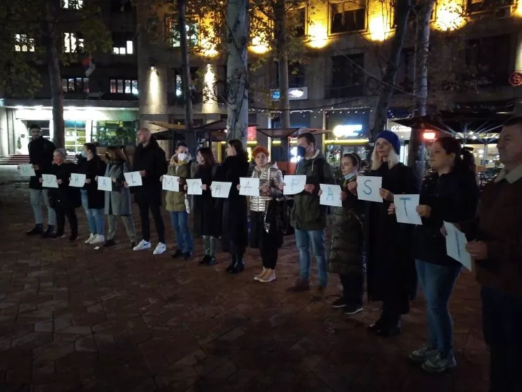 Reporterka N1 javlja da na skupu ima i pripadnika policije u civilu, da je vidjela jedan policijski kombi, ali i, uz građane i aktiviste, i opozicione političare, predstavnike Skupštine slobodne Srbije, DS, Nove stranke… Dodaje da se čuju i pištaljke.