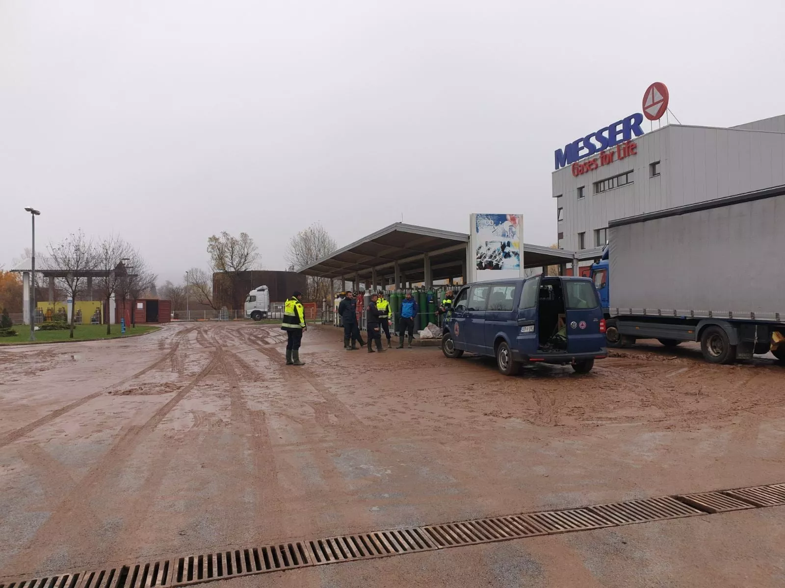 Ljudstvo, kamioni, teške mašine, pumpe za ispumpavanje vode i agregati od jutros rade u krugu ove kompanije na ispumpavanju vode i otklanjanju i saniranju posljedica od poplava te izvlačenju boca s kisikom koje je voda razbacala po krugu ove punionice.