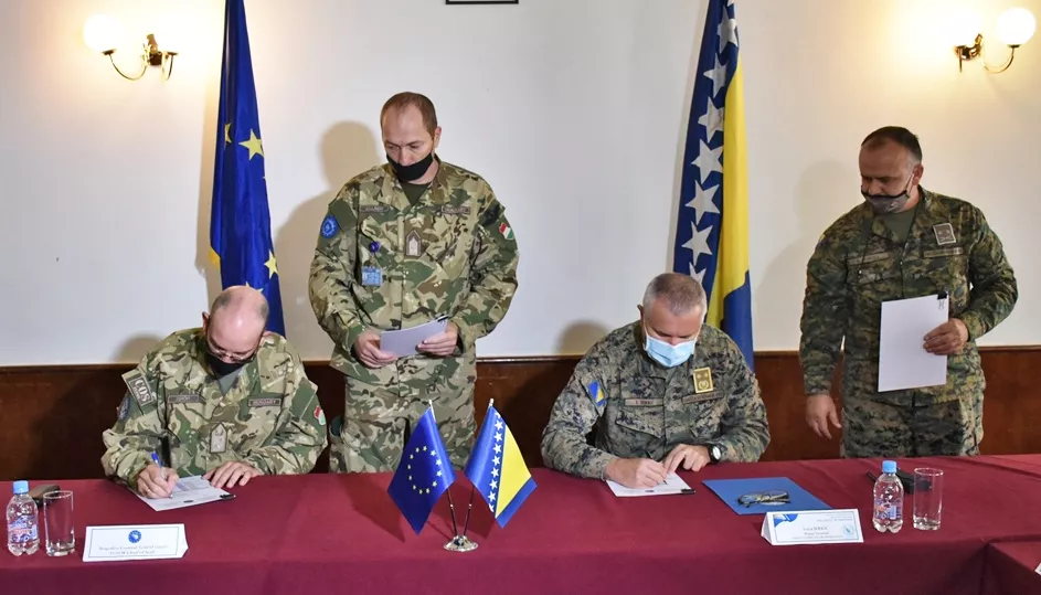 SARAJEVO, (Patria) - Plan obuke i saradnje Oružanih snaga Bosne i Hercegovine sa EUFOR-om za 2022. godinu potpisan je 19. oktobra 2021. godine u Domu OS BiH. Plan su potpisali zamjenik načelnika Zajedničkog štaba OS BiH za operacije generalmajor Ivica Jerkić i načelnik štaba EUFOR-a brigadni general Szilárd Gerőfi.