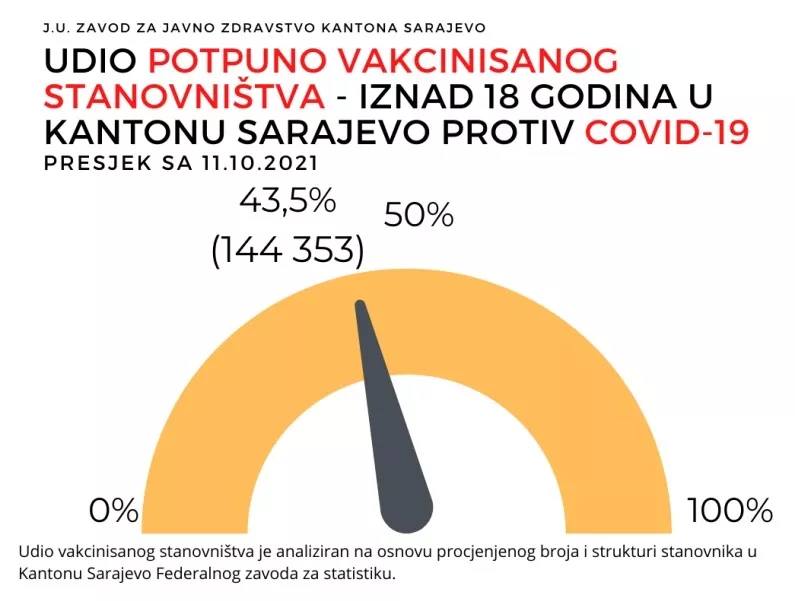 SARAJEVO, (Patria) - Prema Biltenu vakcinacije Zavoda za javno zdravstvo Kantona Sarajevo, do sada je u potpunosti vakcinisano ukupno 144.353 stanovnika našeg kantona protiv Covid-19, što predstavlja 43,5 posto stanovnika starijih od 18 godina.
