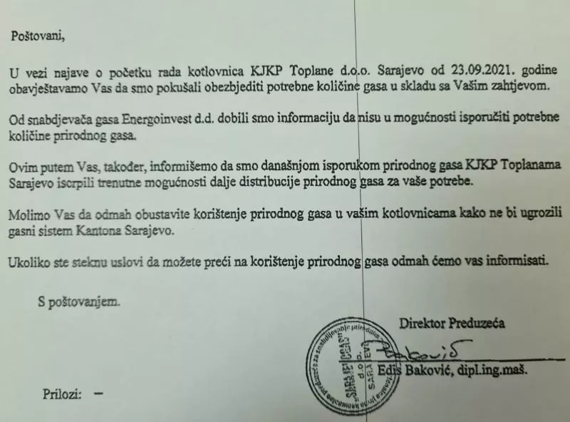 “Od snabdjevača gasa Energoinvest d.d. dobili smo informaciju da nisu u mogućnosti isporučiti potrebne količine prirodnog gasa. Molimo da obustavite korištenje prirodnog gasa u vašim kotlovnicama kako ne bi ugrozili gasni sistem Kantona Sarajevo. Ukoliko se steknu uslovi da možete preći na korištenje prirodnog gasa odmah ćemo vas informirati”, naveo je Baković.
