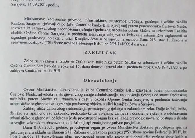Ovo Ministarstvo je zapravo drugostepeni organ, i Centralna banka se obratila ministru Enveru Hadžiahmetoviću (NIP), jer Općina Centar nije izdala urbanističku dozvolu čak 180 dana od dana zahtjeva, a dužni su bili to uraditi u roku od 60 dana.