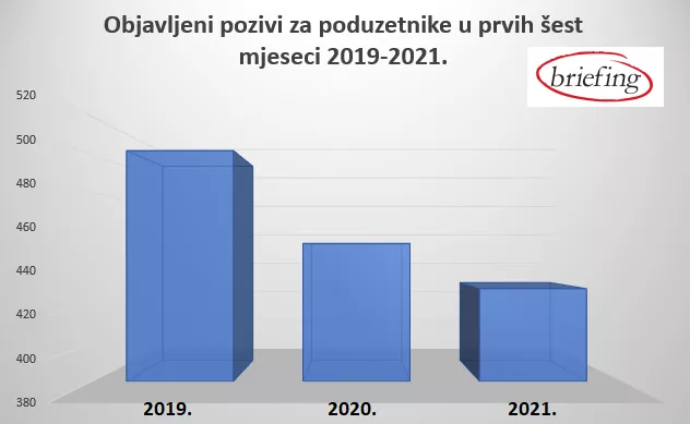 (Patria) - U prvih šest mjeseci 2021. godine objavljeno je 429 poziva/konkursa za sufinansiranje poduzetnika i privrede u BiH, što je za 5,2 posto manje nego u istom periodu prošle godine, podaci su agencije Briefing za praćenje i analizu tendera.