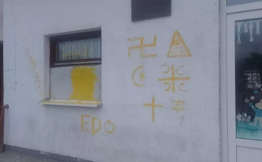 SARAJEVO, (Patria) - Zid na školi "Harmani" u Golubiću kod Bihaća, bio je na meti vandala. Žutom bojom, neko ko je zaboravio primiti kućni odgoj, vaspitanje, a nije bio ni na časovima historije u školi ili neko ko je jednostavno kreten, odlučio je svoj bijes iskaliti na zidu osnovne škole.