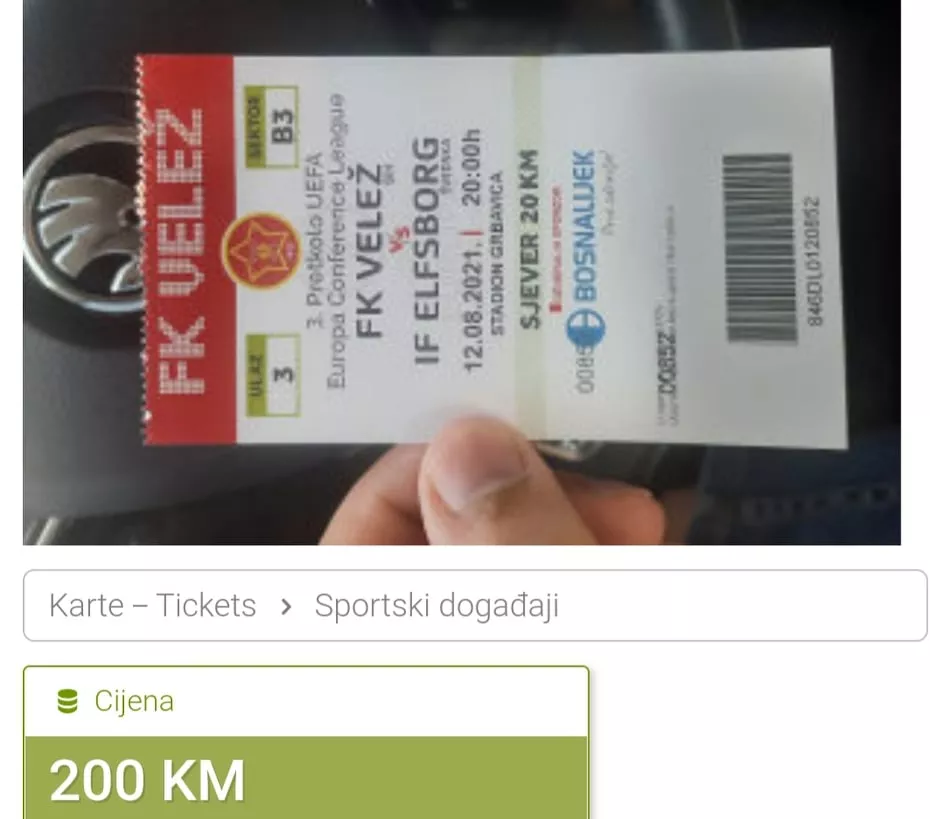 SARAJEVO, (Patria) - Interes za večerašnju utakmicu Veleža i švedskog Elfsborga ne jenjava, a u posljednji čas traže se ulaznice. Na stranici za online prodaju Olx cijena tri ulaznice za istok kreće se i do 300 KM koliko traži jedan ponuđač.