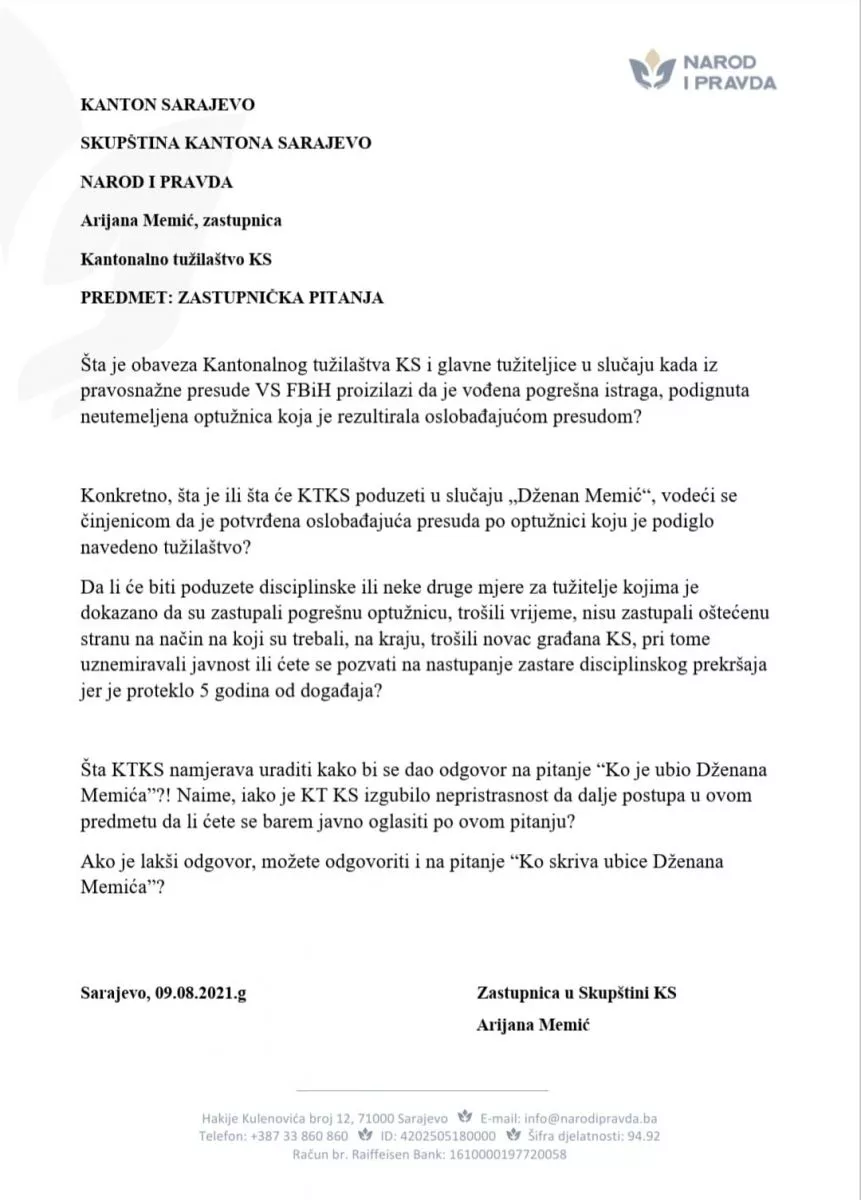 SARAJEVO, (Patria) - Zastupnica Arijana Memić na današnjoj sjednici Skupštine KS uputila je pitanja Tužilaštvu KS nakon što je Vrhovni sud FBiH 27. jula izrekao oslobađajuću presudu Ljubi i Bekriji Seferoviću, koji su bili optuženi da su skrivili saobraćajnu nesreću te da je u toj saobraćajnoj nesreći stradao Dženan Memić.