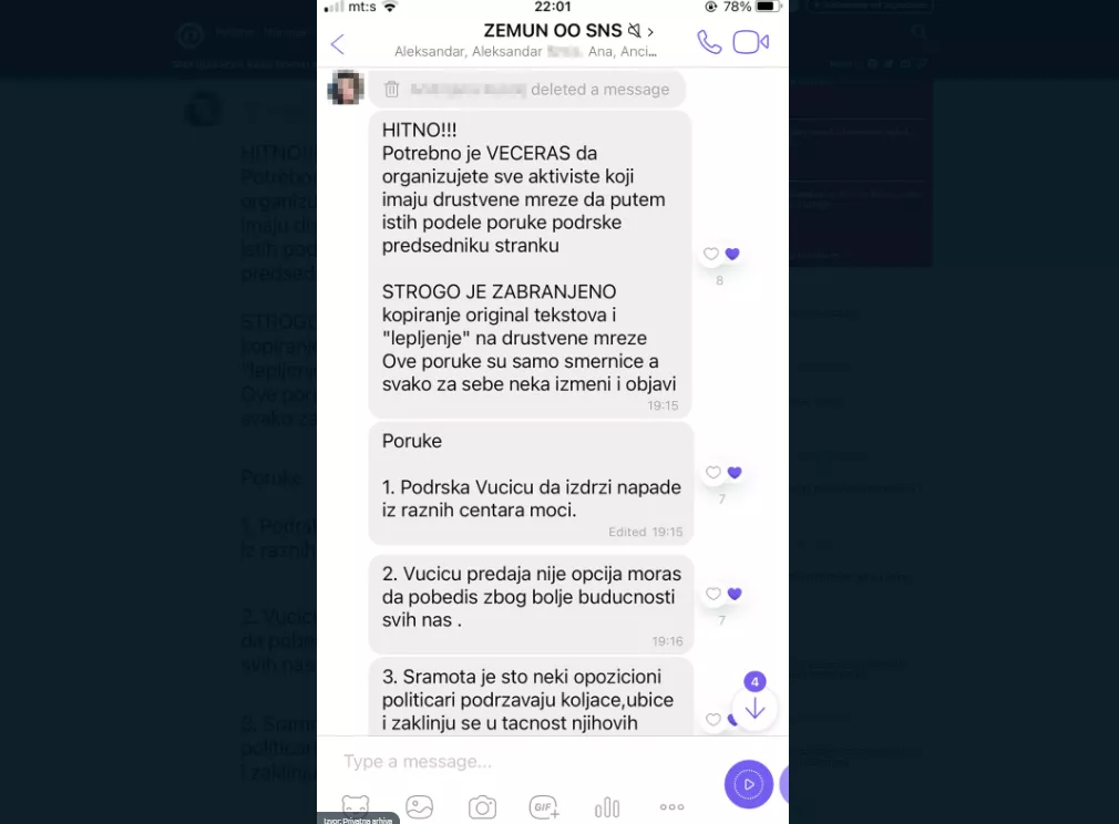“Potrebno je večeras da organizujemo sve aktiviste koji imaju društvene mreže da putem istih podijele podrške predsjedniku države. Podrška Vučiću da izdrži napade iz raznih centara moći, Vučiću, predaja nije opcija, moraš da pobijediš zbog budućnosti svih nas. Sramota je što neki opozicioni političari podržavaju koljače, ubice…”, navodi se u poruci koju su dobili zemunski naprednjaci, a koja se dijelila na društvenim mrežama.